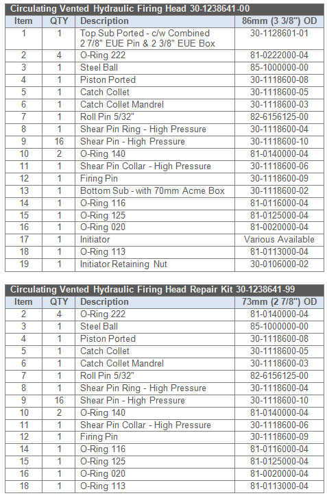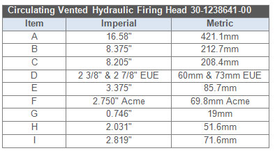 The Circulating Vented Hydraulic Firing Head is to be run in on tubing or coil tubing until the system is on depth. With the vent holes being open to the annulus, the tubing fills with well bore fluid and the pressure remains balanced between the tubing and annulus allowing for well control or circulation of different fluids before firing the head. Once the conditions are correct for firing the head, a ball of the correct size and composition is pumped down the tubing making a seal on the piston. This allows the tubing to be pressured up to the calculated pressure and fire the perforating system or pyrotechnic tools below the head. The piston continues to travel and locks open the vent holes allowing for communication between the annulus and tubing again.