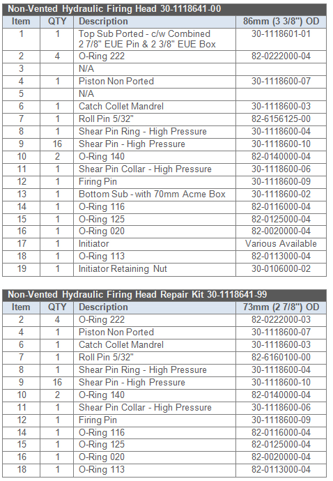 The Non-Vented Hydraulic Firing Head can be run in on tubing or coil tubing until the system is on depth. The tubing is filled with fluid or gas, pressured up until the predetermined shear value is reached and the shear pins shear. This fires the initiator causing the gun or accessory to fire. BRICO Hydraulic Firing Heads may be run to operate jet cutters on coil, tubing and drill pipe. This firing head can be run as an alternative or a redundant firing head on the bottom of the guns.
